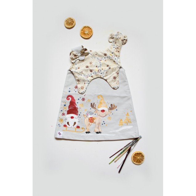Rochita copii tip sarafan, din bumbac, culoare gri, pictat manual cu ren si Mos Craciun